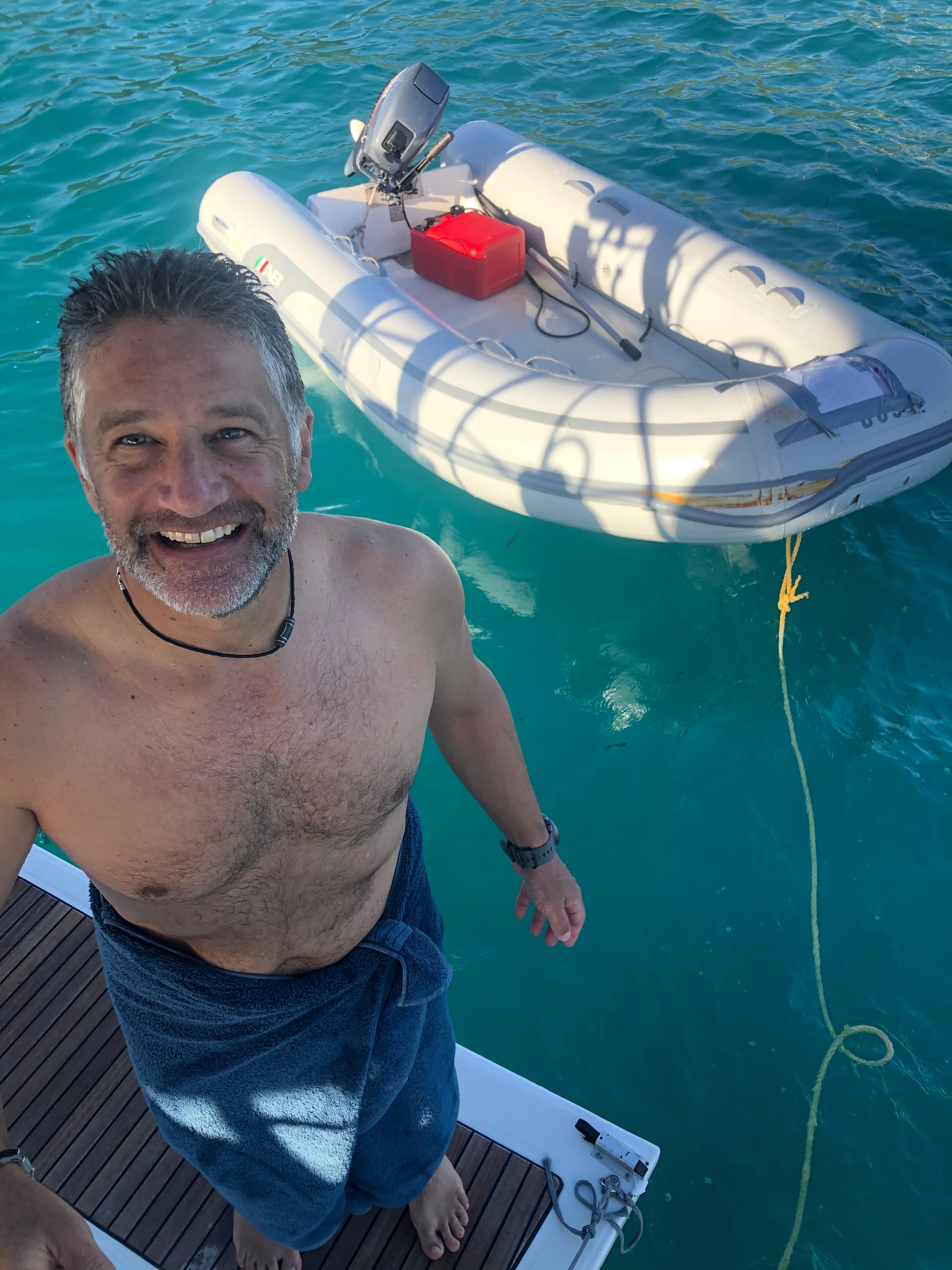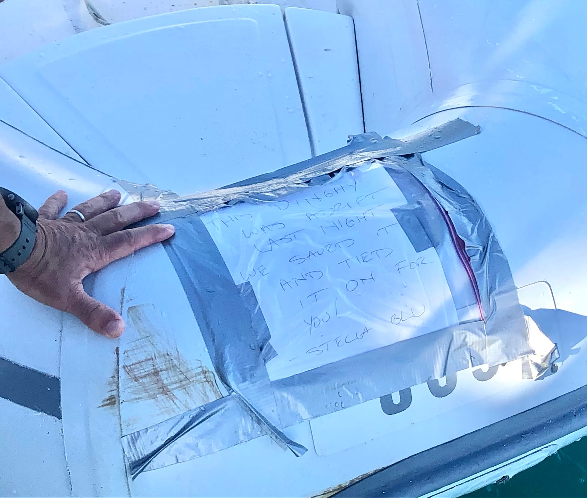 Oh, several days later, we lost and then regained the Soujourn II’s dinghy. Somehow, we didn’t secure it properly that evening. After a sleepless night, we stalked the anchorage quietly at sunrise in our boat and located it. Some kind souls found it adrift, attached it to their boat’s stern, and added a handy note of explanation that we could read through our binoculars. Once identification was confirmed, Peter swam over and collected it. Thanks Stella Blu!