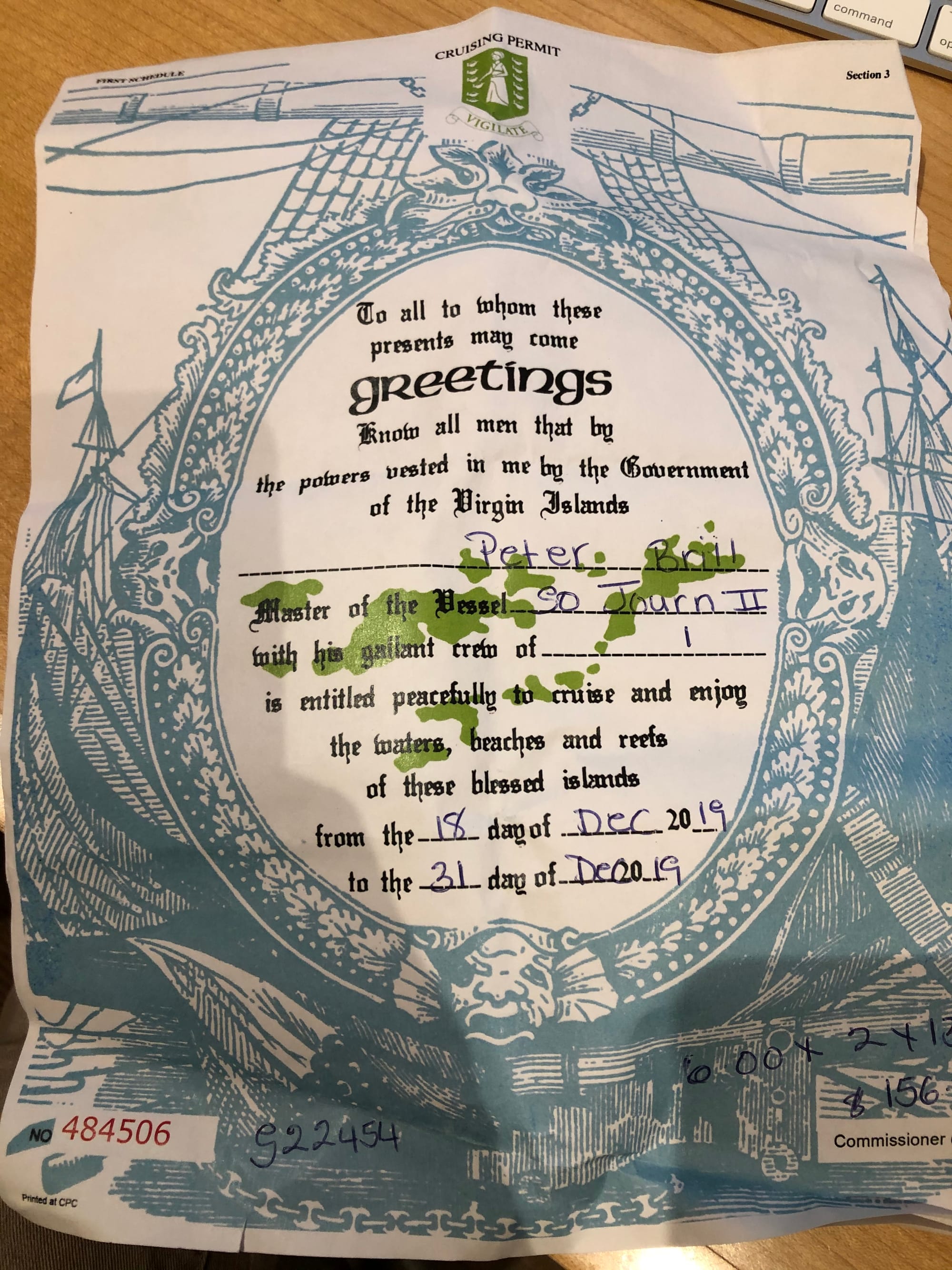 Salty Captain Pete, La Choza Restaurant, Hat and Pipe a Good Luck Gift from Sam and Shane, 2019 / BVI Cruising Permit, 2019